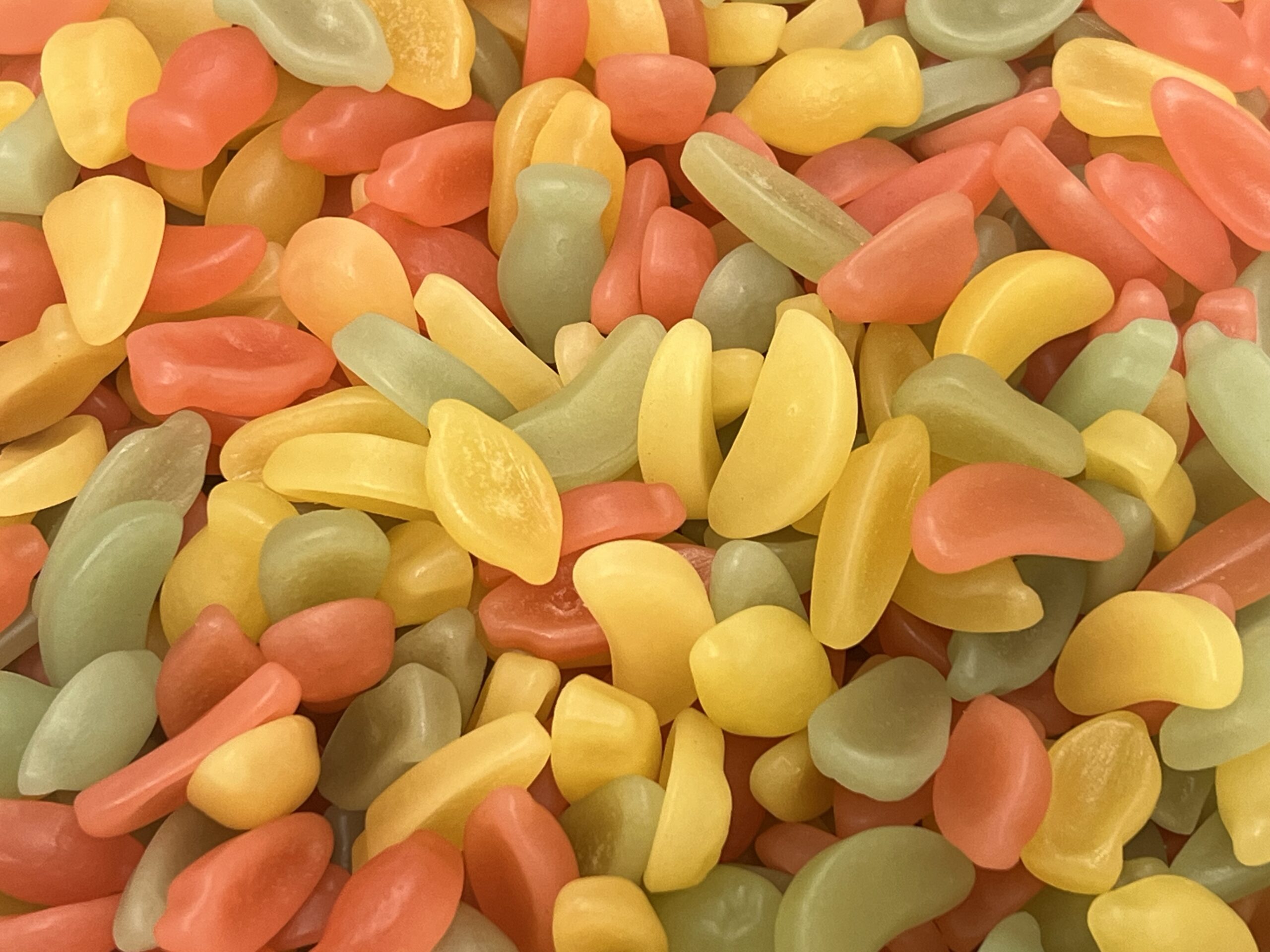 Socker, glukossirap, gelatin, stärkelse, syra (E270), vegetabilisk olja (kokos, raps), aromer, ytbehandlingsmedel (karnaubavax), färgämnen (E120, E141, E160a).