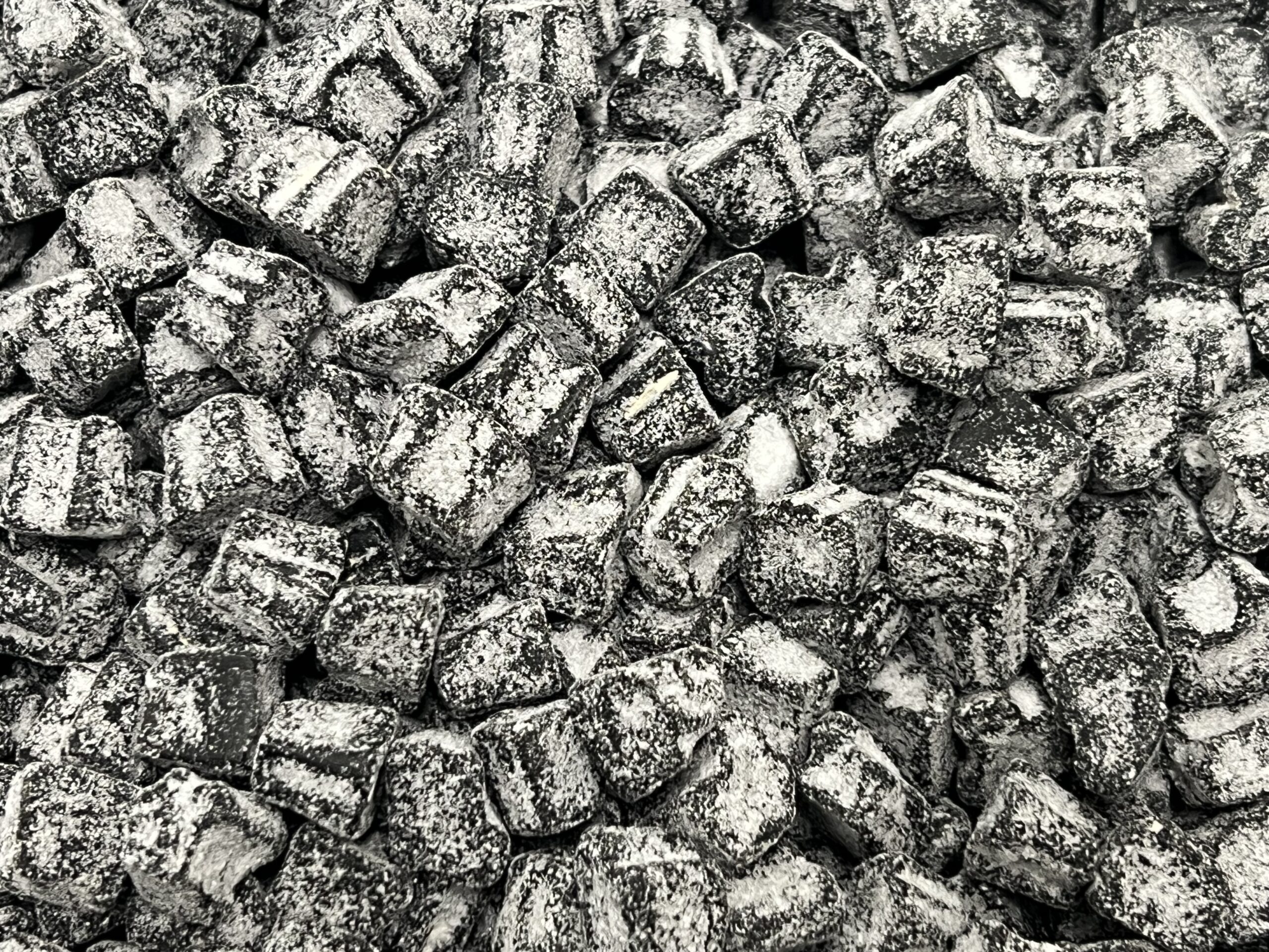 Socker, glukossirap, stärkelse, modifierad stärkelse, ammoniumklorid, (=salmiak), lakritsextrakt, färgämne (E153), aromämne.