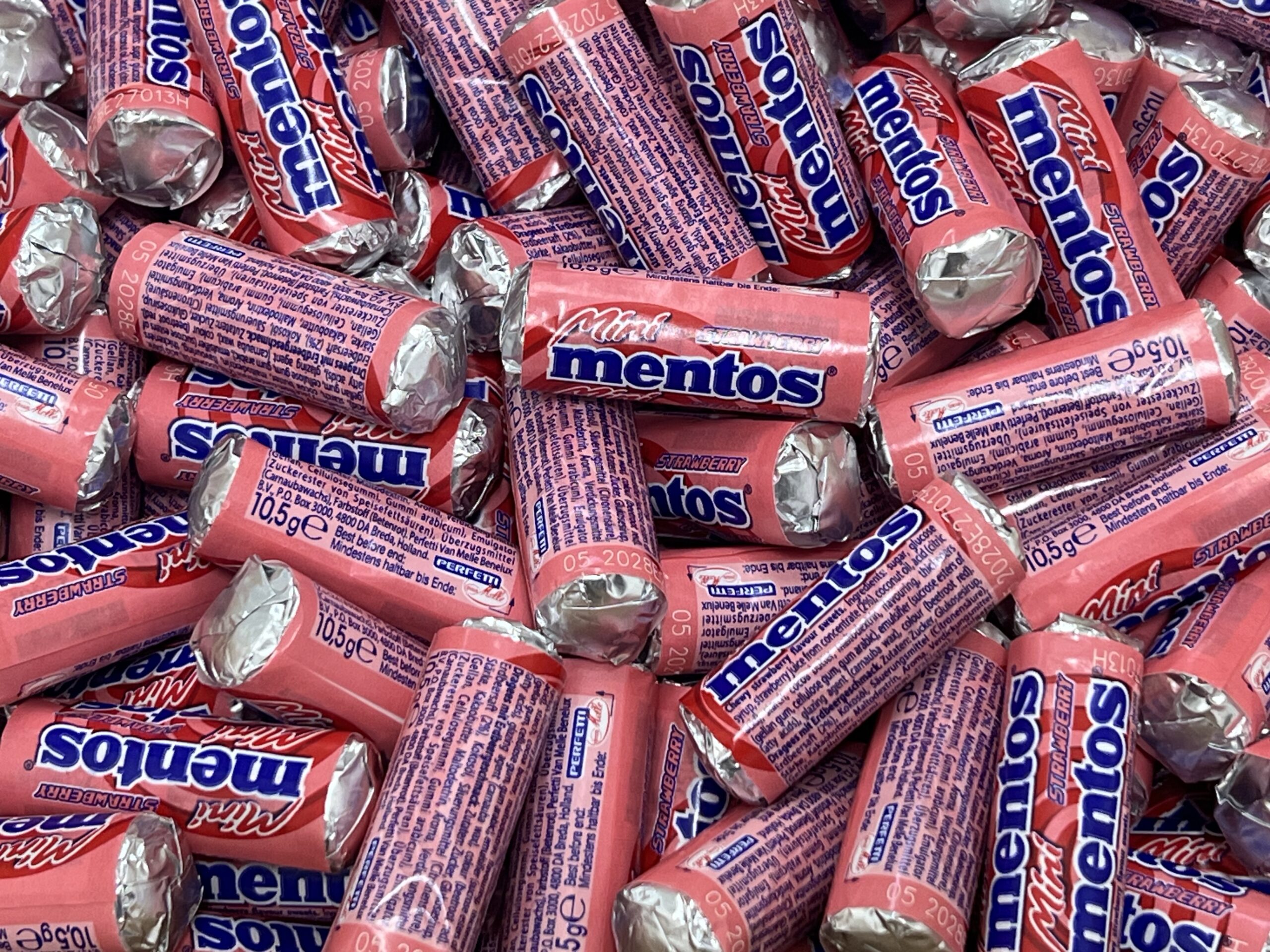 Sokeri, glukoosisiirappi, kookosöljy, happo (sitruunahappo), tärkkelys, maltodekstriini, luontaiset aromit, tiivisteestä valmistettu mansikkamehu, kaakaovoi, emulgointiaine (rasvahappojen sakkaroosiesterit), sakeuttamisaineet (gellaanikumi, selluloosakumi, arabikumi), pintakäsittelyaine (karnaubavaha), väri (E162).
