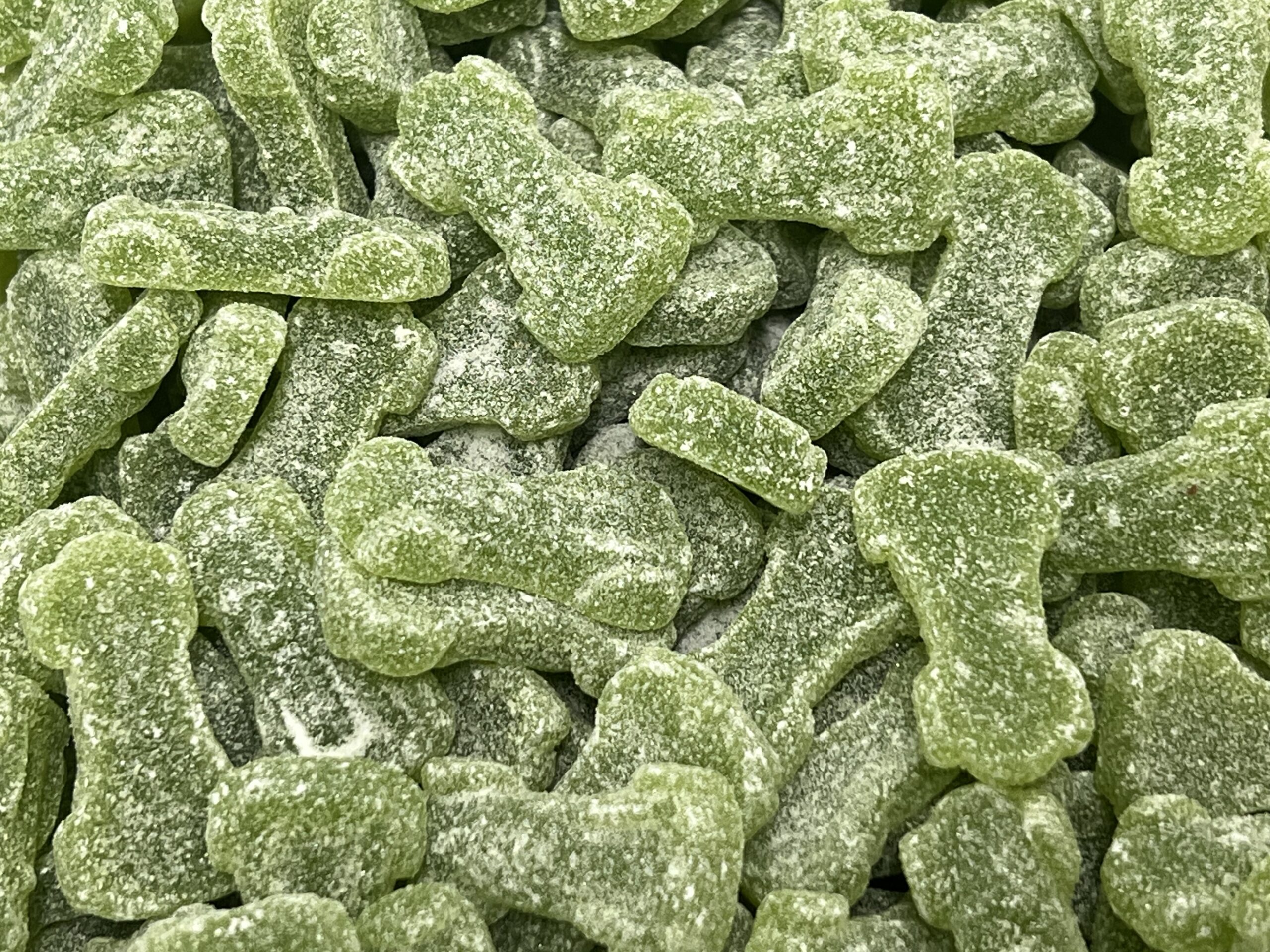 Socker, glukossirap, modifierad stärkelse (majs), gelatin, syror (mjölksyra, citronsyra, äppelsyra), arom, färgämnen (kopparkomplex av klorofyller och klorofylliner, kurkumin).